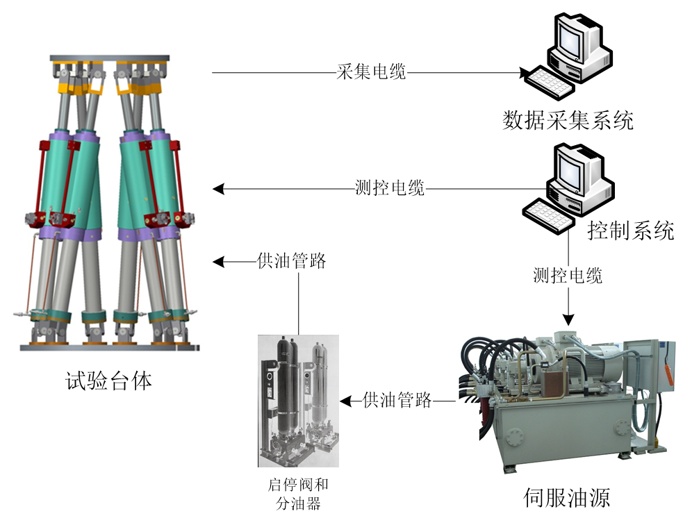 液壓搖擺臺由試驗臺體、控制系統、伺服油源、子站和數據采集系統等主要部分組成。其中,試驗臺體是由6臺作動器組成的六自由度運動平臺,用于實現試驗件的單自由度正弦運動或多自由度復合正弦運動。控制系統控制試驗臺體或者單個作動器按指令運動。伺服油源為系統運動提供動力。啟停閥用于控制伺服油源動力的通斷。分油器將油液輸送到試驗臺體的各執行機構中。數據采集系統采集存儲試驗數據。